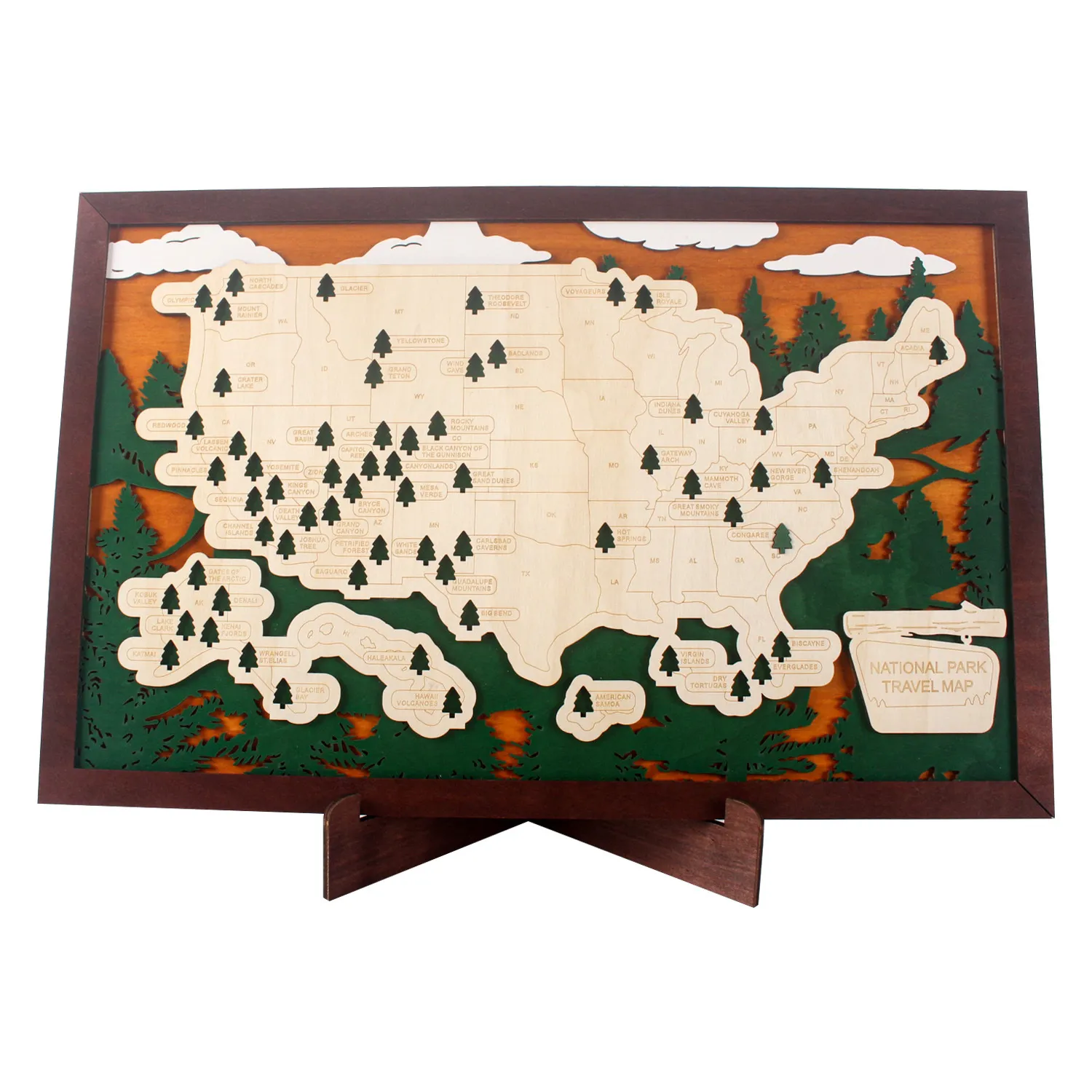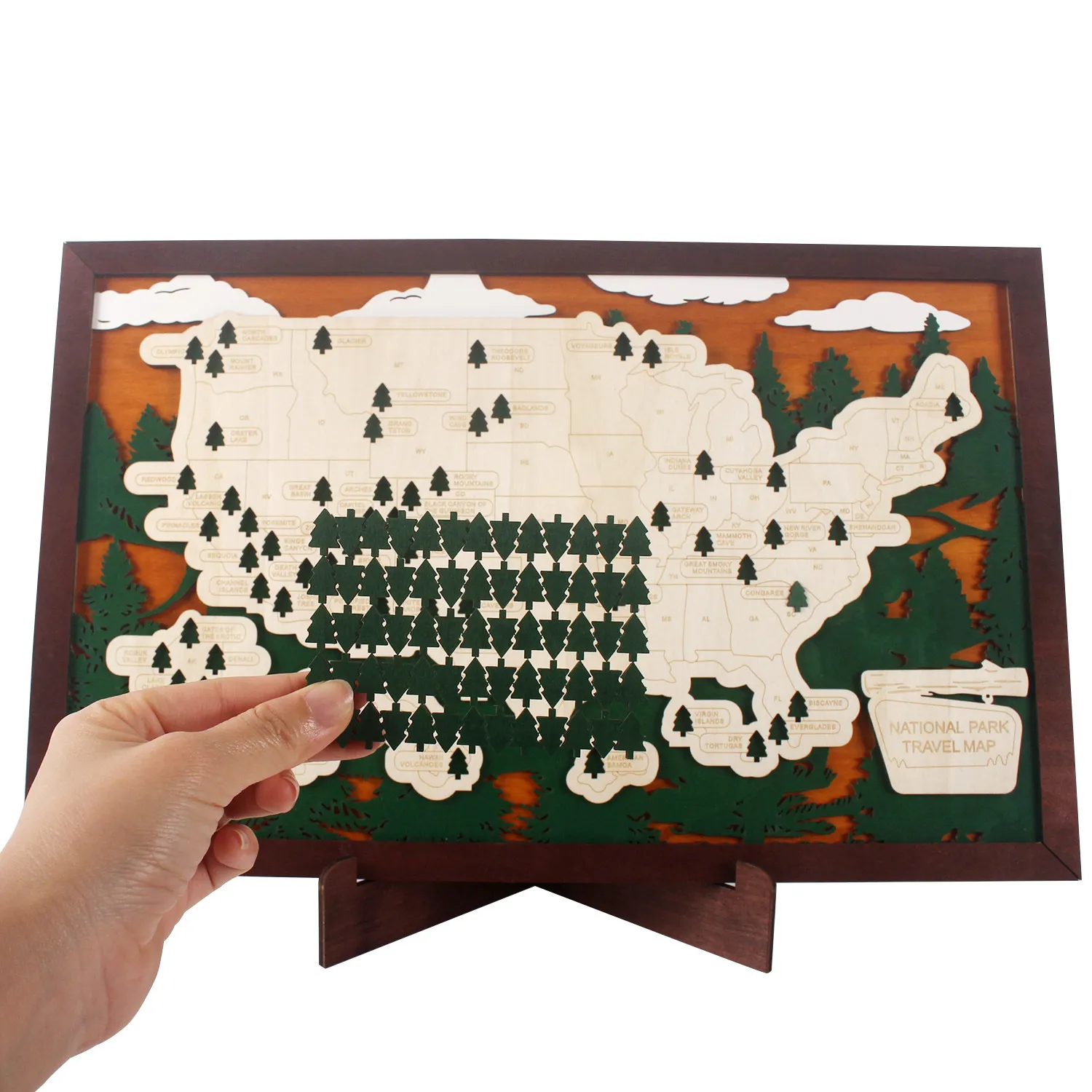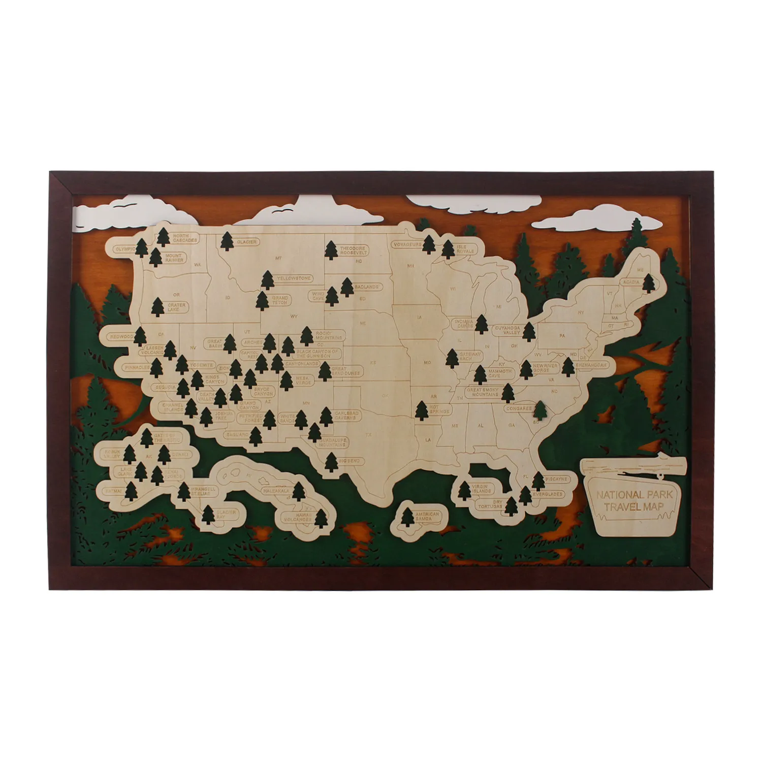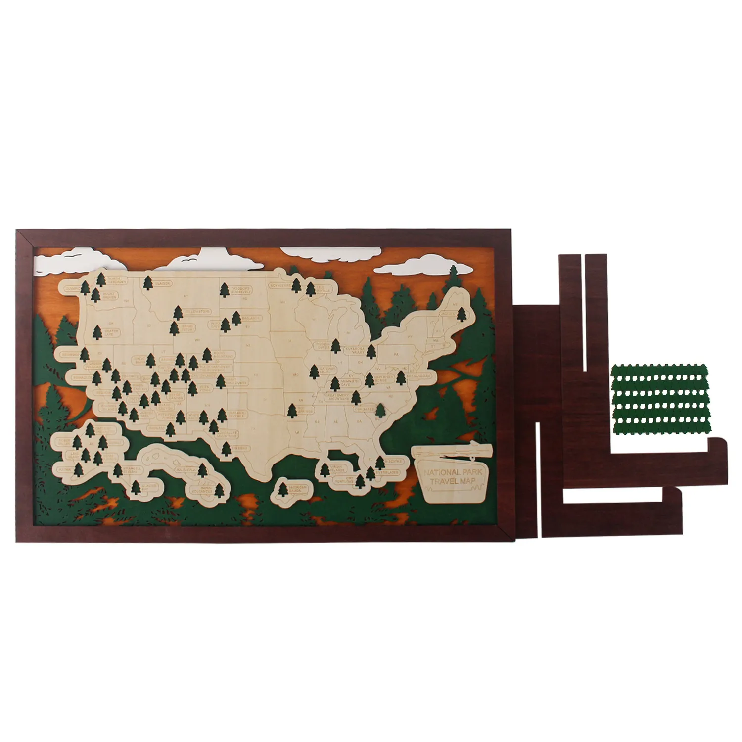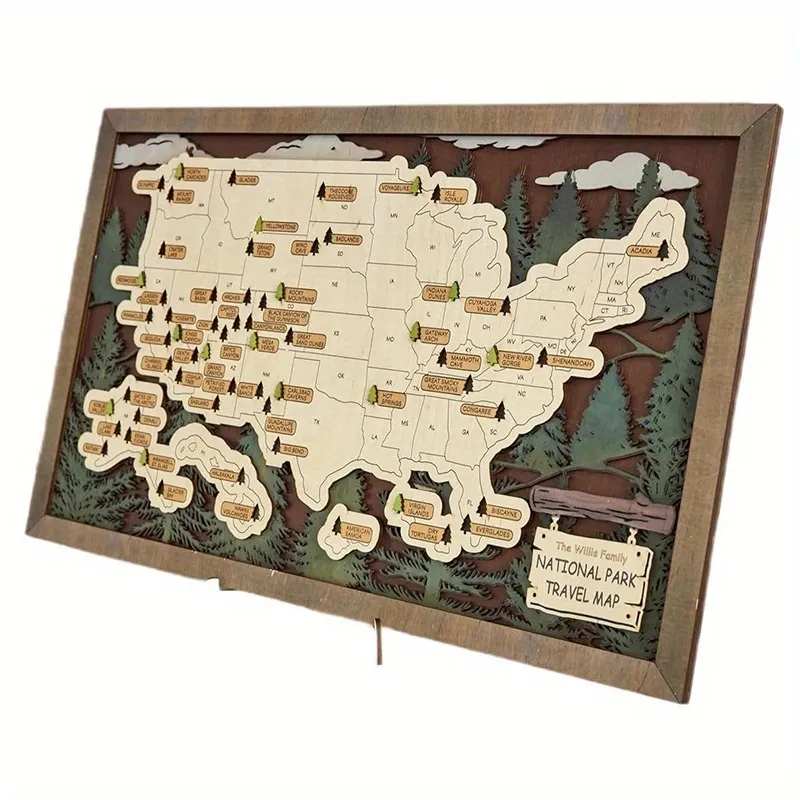 - MARK YOUR ADVENTURES: Easily add adhesive backed trees to the places you’ve traveled and fill in your personal national parks bucket list. This wood map is more than a mere decorative piece; it’s a reflection of your growth, discovery, and accomplishments.