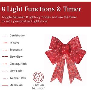 At its core, it features bright red pre-strung LED lights and 8 customizable light modes: In Wave, Sequential, Slow Glow, Chasing/Flash, Slow Fade, Twinkle/Flash, Steady-On, and Combination. A built-in timer lets users set it to “8 hours on, 16 hours off”—no daily manual switching needed. The 10ft power cord offers flexible placement (no need for extension cords in most yards), and the modern minimalist bow design blends with various outdoor styles, from classic to contemporary. Whether hung on doors, placed by lawn edges, or used as a centerpiece for holiday gatherings, it adds instant seasonal joy.